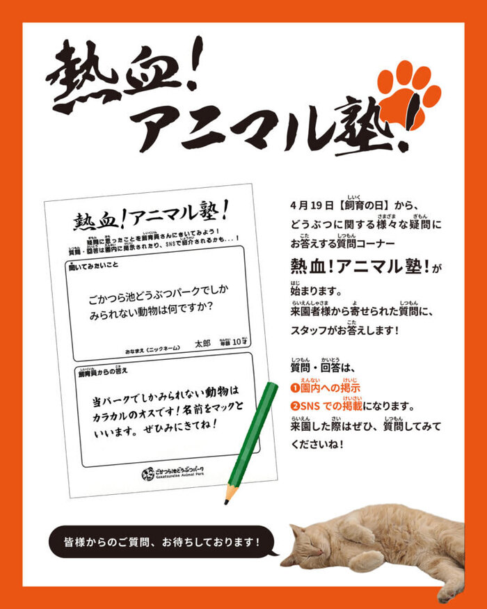 2025年4月19日=飼育の日からスタートした「熱血!アニマル塾!」は、「ごかつら池どうぶつパーク」の飼育員さんたちが来園者の質問に答えるという企画です。