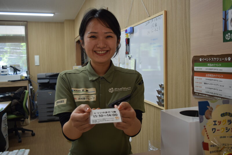 飼育員さんに券を渡すと、おやつのあげ方と「ごかつら池どうぶつパーク」にいるヒツジさんについて詳しく説明してもらえます。