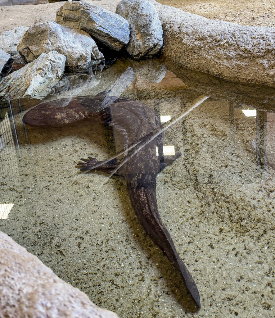 「ごかつら池どうぶつパーク」には、2匹のオオサンショウウオがいて、エントランスすぐの「おいないぞーん」で来園者を迎えてくれています。