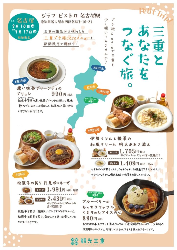 三重プチ旅Cafeが、9/10(水)〜9/17(水)まで(※火曜定休)ジラフ ビストロ 名古屋駅店で期間限定開催!