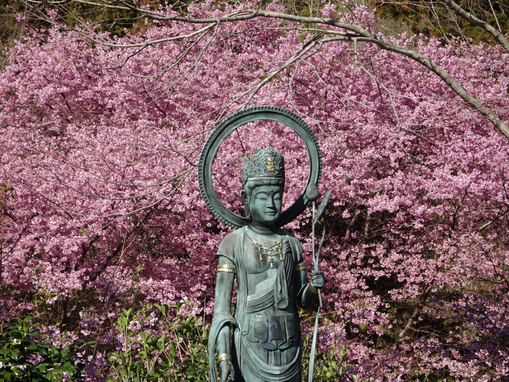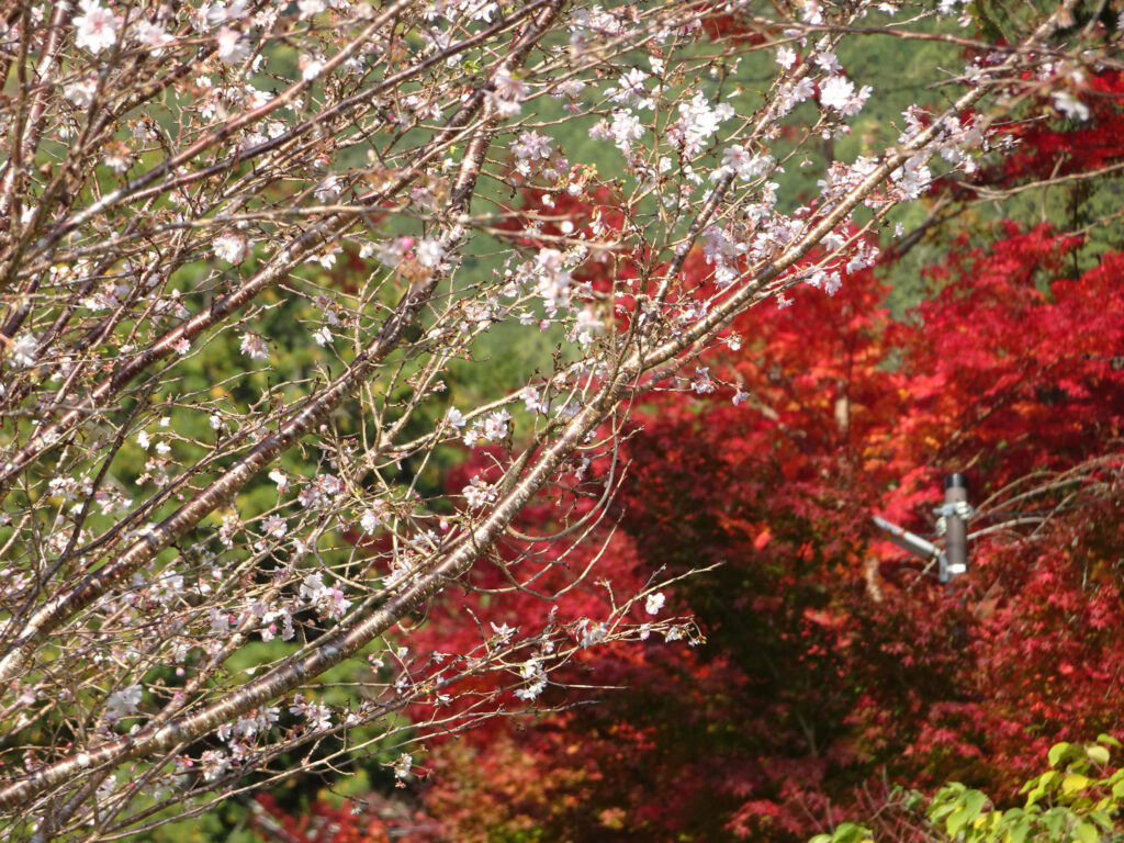 春は河津桜が咲き誇り、10月ごろには紅葉と十月桜が同時に楽しめる珍しい景色が広がります。