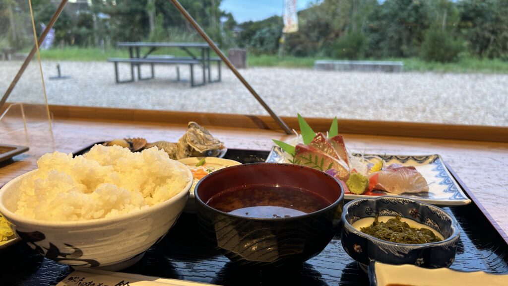 隣接のお食事処では新鮮な海鮮を楽しめる定食を味わえるため、買い物と食事を同時に楽しめます。