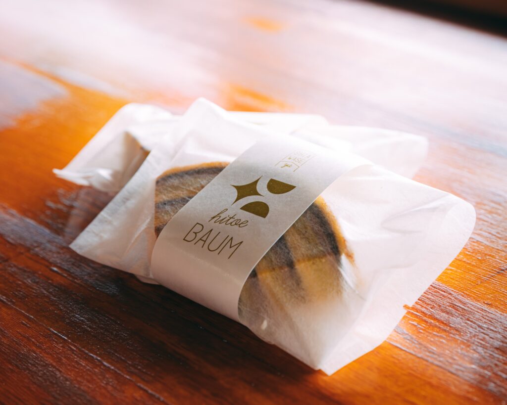 「めい姫の十二単バウム」は、めい姫が身にまとう「十二単」をモチーフに、4色の生地で表現したカラフルな12層のバームクーヘンです。