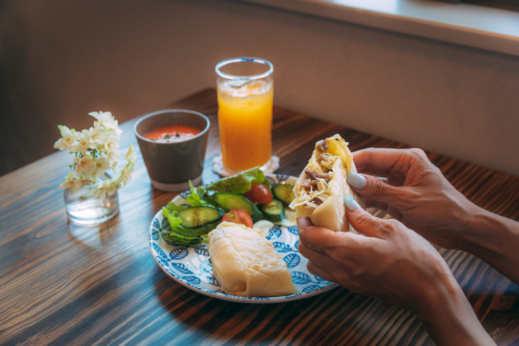薄く焼かれたトルティーヤに、お肉や野菜、チーズがぎっしり詰まっていて、食べ応えも十分。