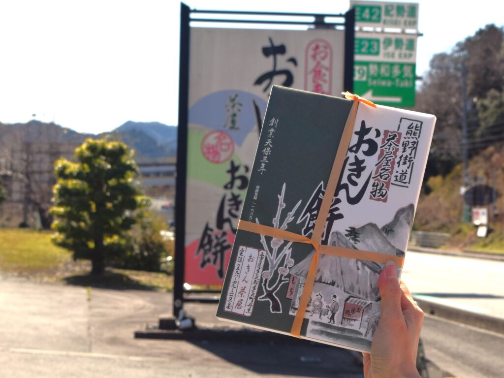 熊野街道の茶屋名物であるおきん餅のパッケージには、「天保3年創業」と記されています。