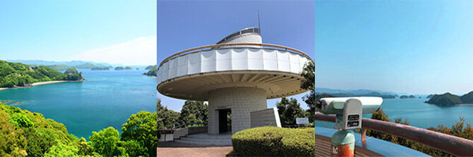 高塚山に熊野灘臨海公園内の展望台 白亜の建物内の階段を上ると360度1周することができ、無料の望遠鏡が設置されています。