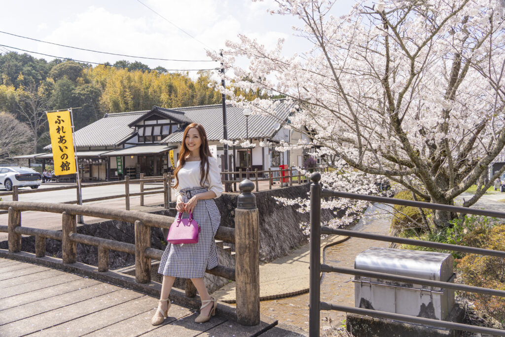次の桜スポットへは、特産品販売店「ふれあいの館」駐車場に車を停めて向かいます。地元「川原製茶」が手掛けているお店なので、お茶を使った和スイーツでおいしいカフェタイムを過ごすのも◎