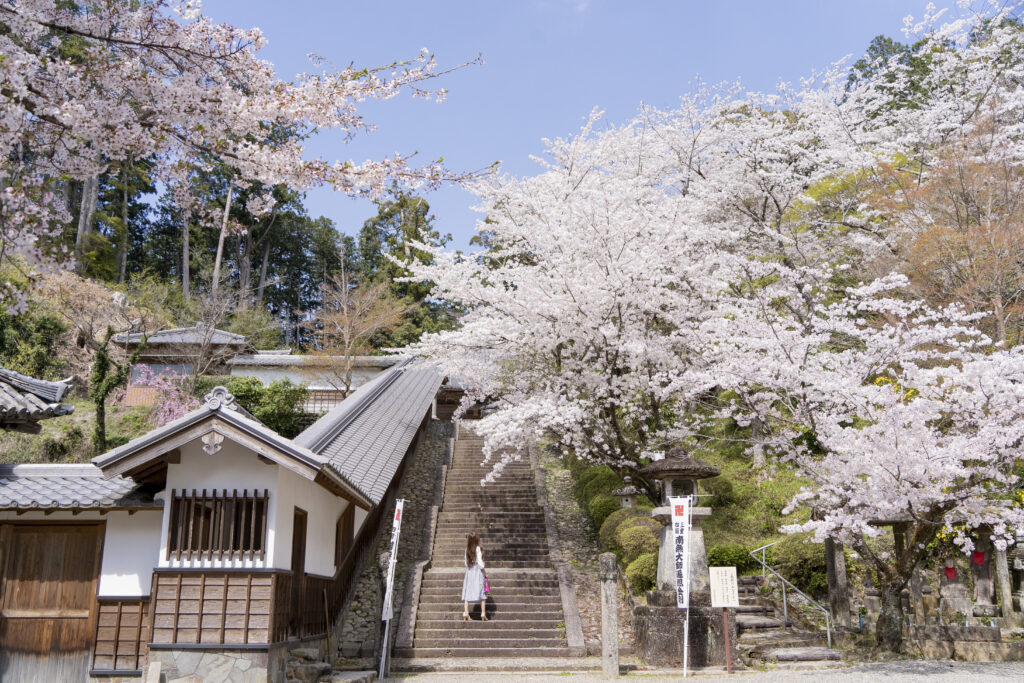 丹生大師と呼ばれる「丹生山 神宮寺(じんぐうじ)」は、「丹生のお大師さん」として古くから親しまれています。悠久の歴史を感じるお堂の近くには、階段に迫るように花を咲かせる立派な桜の木々があります。