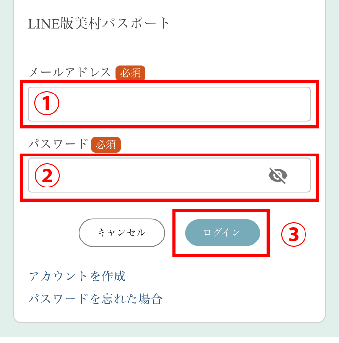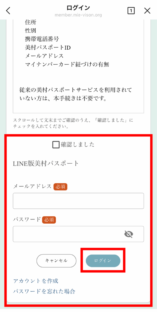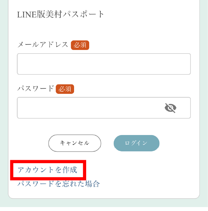 赤枠の「アカウント作成」をタップすることで、LINEの画面から「アプリ版の美村パスポート」アカウントを新規作成することができます。