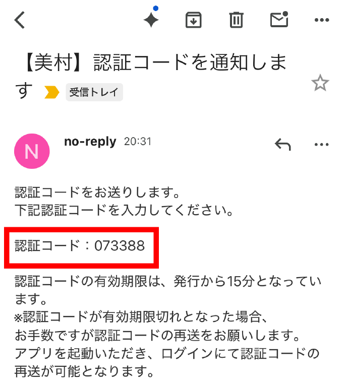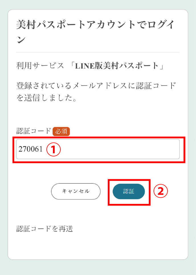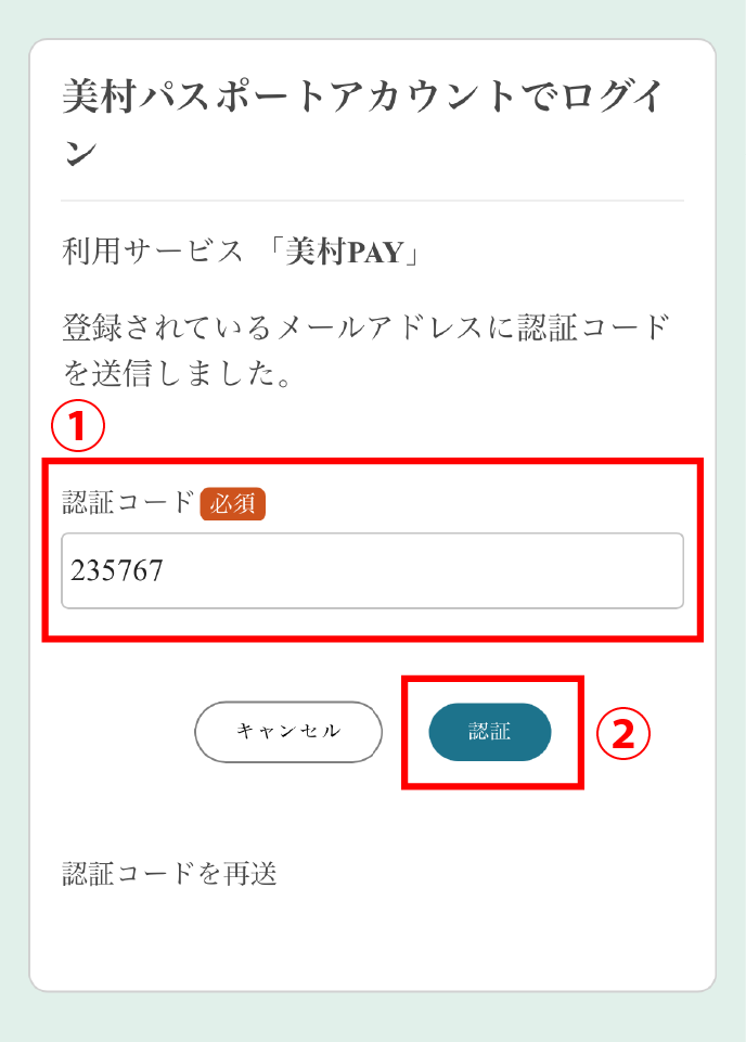 ①美村PAYに登録されたメールアドレスに届いた認証コードを入力
