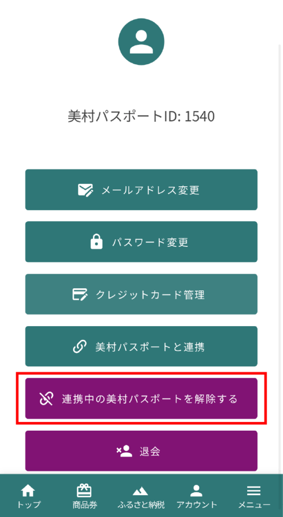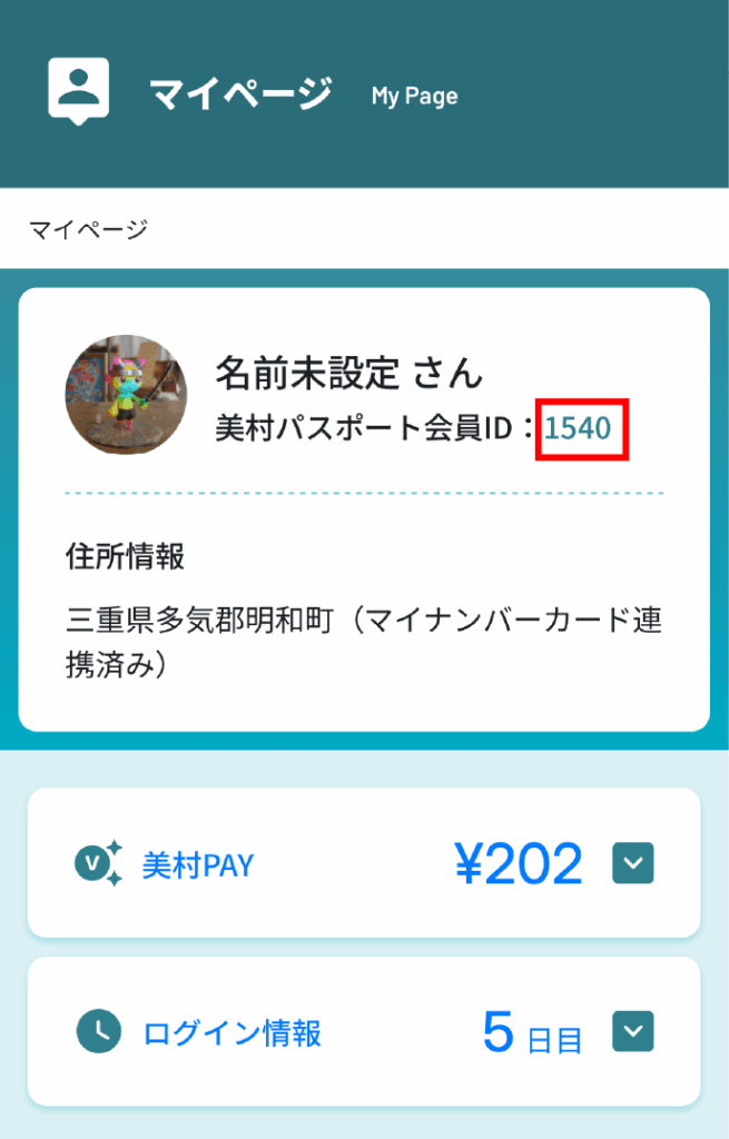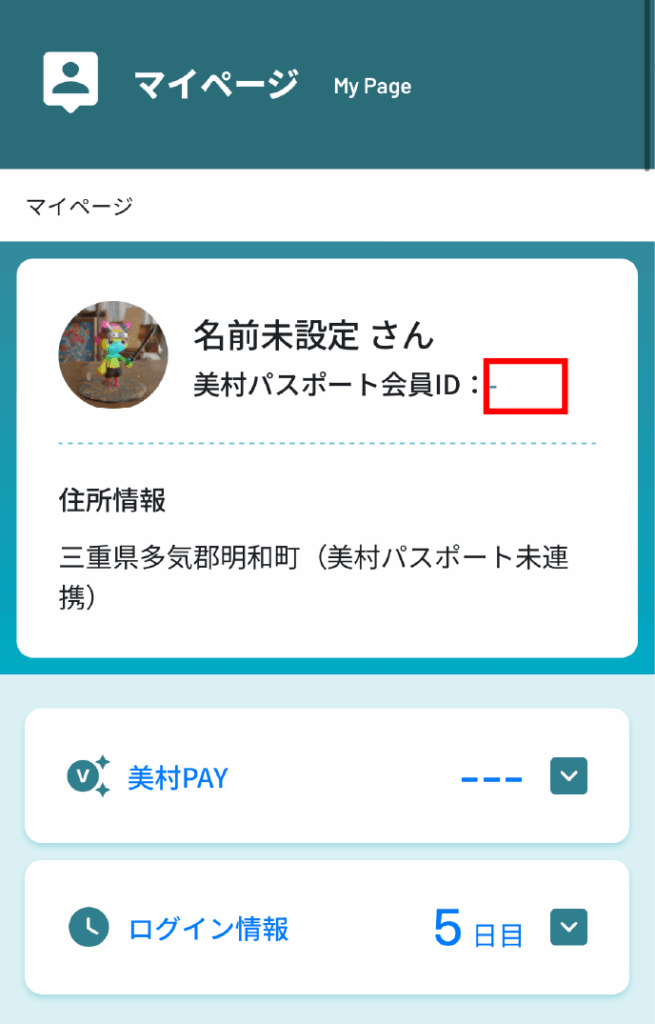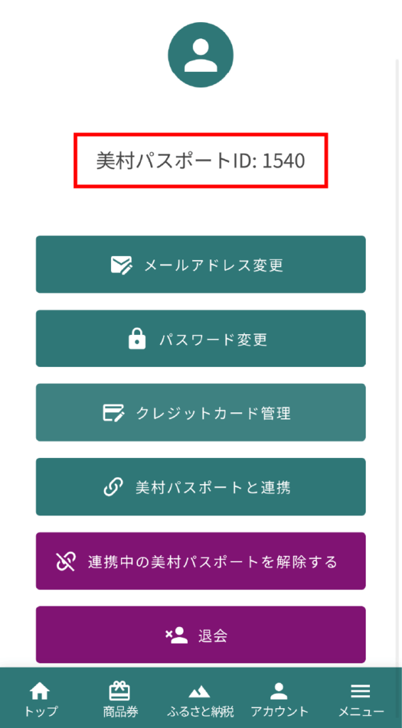 アカウントをタップ後に表示される画面に「美村パスポートID:◯◯◯◯」の表記を確認する。