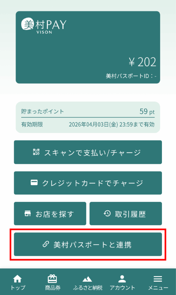 ステップ.1 美村PAYへログイン後に「美村パスポートと連携」をタップする