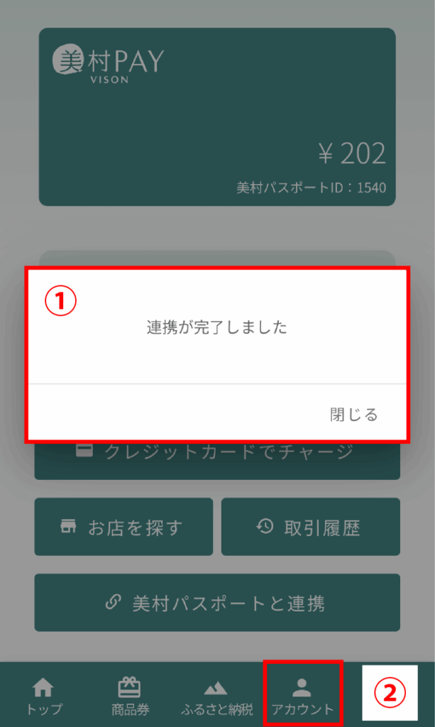 こちらで、「美村PAY」と「アプリ版美村パスポート」との連携は完了です。