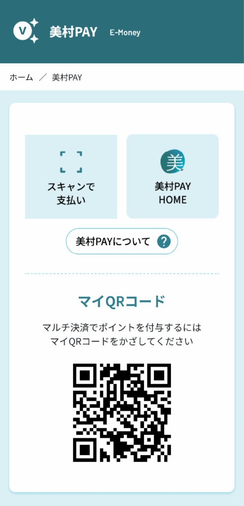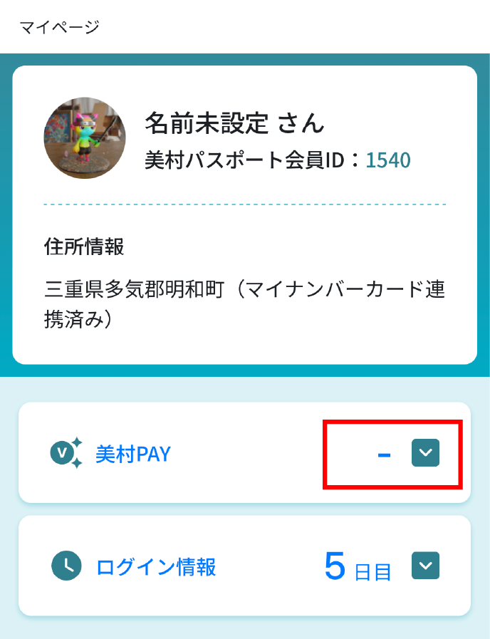 下記の画像は、アプリ版「美村パスポート」と「美村PAY」が連携されている方の画面表示です。