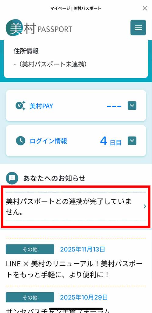 あなたへのお知らせに「美村パスポート」との連携が完了していません。」と表示されるので、赤枠の箇所をタップする。
