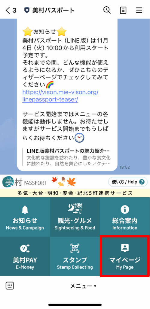 友だちから「美村パスポート」を開き、リッチメニューに表示される「マイページ」をタップしてください。