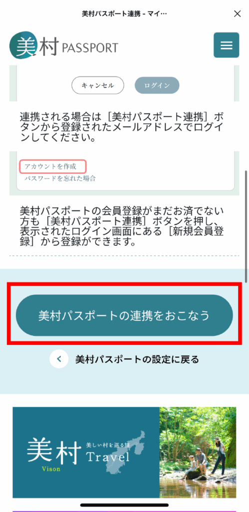画面を中央へスクロール後に表示される「美村パスポートの連携をおこなう」をタップする。