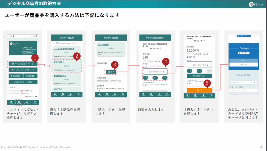 ステップ3の美村PAYの画面より「スキャンで支払い/チャージ」をクリックするとデジタル商品券の購入画面へ推移します。デジタル商品券を購入することができます。