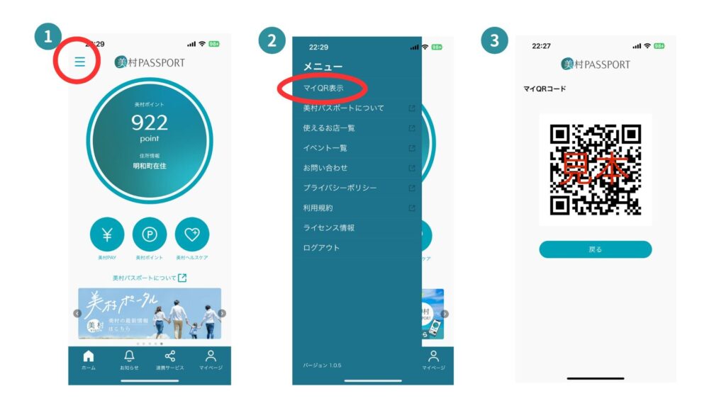 利用方法はとても簡単。美村パスポートアプリ内の『マイQR』を店舗スタッフが読み取ってもらうだけで、すぐにポイントが付与されます。